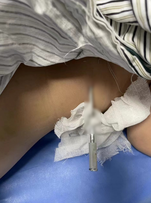 12厘米长的地钉,约一半插入孩子体内。但幸运的是,经检查,地钉扎入位置比较偏,没有竖着深插伤及重要内脏。经急诊手术,医生顺利取出地钉,并清理污染伤口。后续,孩子被转入普通病房住院治疗,还需观察伤口及全身感染情况。